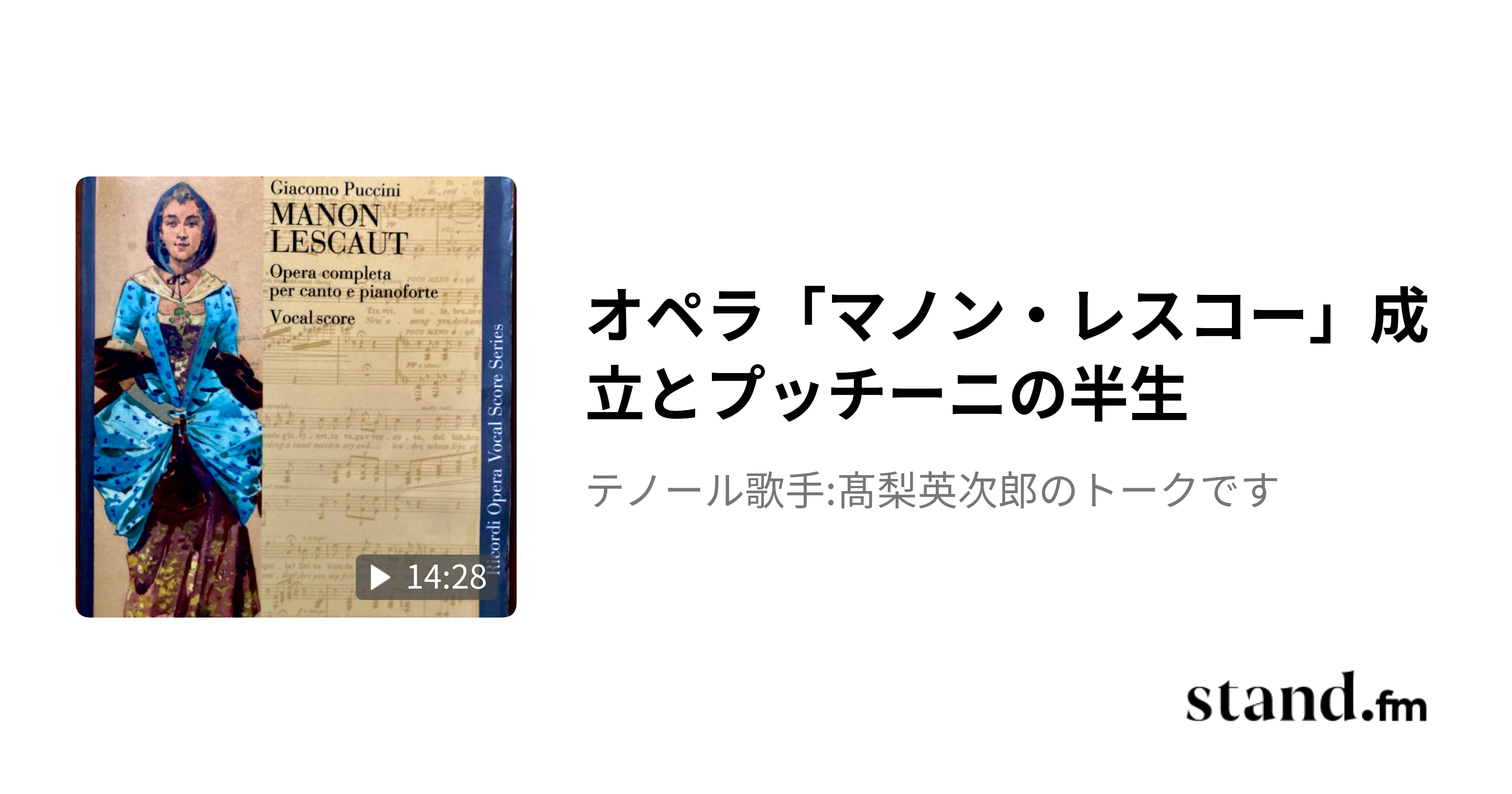 オペラ「マノン・レスコー」成立とプッチーニの半生 - テノール歌手:髙梨英次郎のトークです | stand.fmプッチーニ作曲のオペラにして最初の大ヒット作「マノン・レスコー」の成立と初演、そこに至るプッチーニの半生をご紹介! 文字起こしブログはこちら↓ #オペラ #プッチーニ #マノンレスコー #イタリアオペラ #クラシック #クラシック音楽